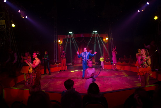 Eine dichte, heimelige Atmosphäre erwartet die Besucher im edel eingerichteten Chapiteau. Blickfang ist der große feine Artisteneingang. Eine breite rote, mit erhabenen goldenen Ornamenten besetzte Blende rahmt den dunkelroten Samt der Gardine ein. Elegante, mit Polsterstühlen ausgestattete Logen und ein steil aufragendes, siebenreihiges Gradin füllen den Raum restlos aus.