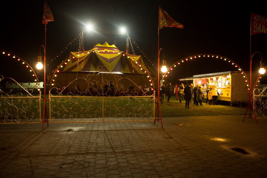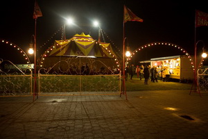 Der große, dekorativ mit Clownsköpfen und zahlreichen Ornamenten gestaltete Fassadenwagen, er beherbergt auch die Kassenschalter, lädt zum Besuch des Circus ein. Er wird flankiert von einem nostalgisch verspielten Zaun, der von Lichterbögen und Kandelabern gekrönt wird.