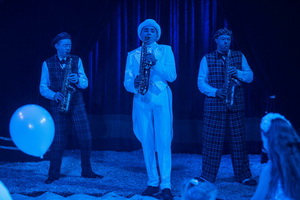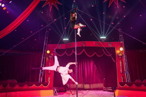 Richard, jüngster Sohn des Hauses, kommt hinzu und das Trio spielt gekonnt auf seinen Trompeten. Das vierköpfige Ballett des Hauses tanzt in phantasievollen Kostümen und Bella Hartmann zeigt Ausschnitte ihres Könnens an den Tuchstrapaten.