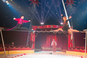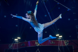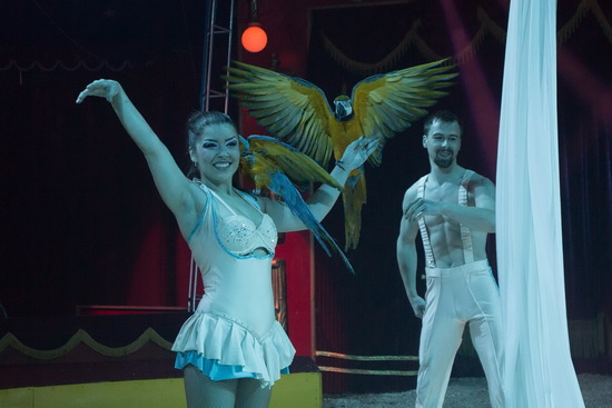 Eine sehr interessante Darbietung bietet das Duo im zweiten Programmteil. In die Arbeit an Strapatentücher sind zwei prachtvolle Aras eingebunden. Die großen Vögel ziehen leicht und lautlos schwebend ihre Bahnen über das Gradin und begleiten die Artisten, auf deren Gliedmaßen sitzend, bei ihren effektvollen Tricks hoch in der Kuppel.