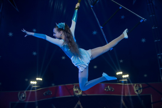 Kimi Hartmann arbeitet eine formidable Kür am Trapez. Viele kräftezehrende Haltetricks und effektvolle Balancen reihen sich zu einer publikumswirksamen Trickfolge, die in erstklassiger Ausführung dargeboten das Publikum begeistert.