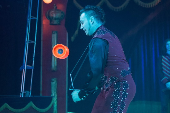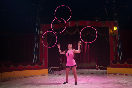 Wenig später sehen wir Kelly Joo mit einem interessanten Jonglage Act. Mit Hula Hoop Reifen führt die sympathische Artistin ihre abwechslungsreichen Routinen aus. Drei und fünf Reifen werden sehr sicher in vielerlei Variationen manipuliert. Den Höhepunkt ihres Auftritts markiert die Jonglage mit sieben Reifen.