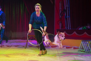 Ewa Korittnig-Barones bringt zwei Hunde in den roten Ring, die in spielerischem Ablauf eifrig ihr Können zeigen. Verschiedene Sprünge, Lauf auf den Vorderpfoten und Hochsitzer werden mit Begeisterung ausgeführt.