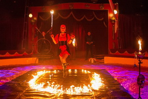 Miss Zanetta bietet eine veritable Feuershow. Im Piraten-Outfit wirbelt die Artistin brennende Taue und Stangen um ihren Körper. Hohe Feuersäulen stößt sie mit dem Mund in Richtung Kuppel aus.