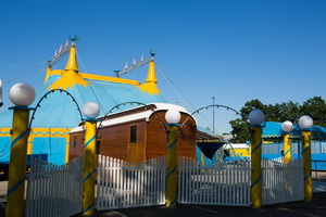 Auf dem Parkplatz des städtischen Sportgeländes war der Circus in vollem Glanz aufgebaut. Die elegante breite Fassade empfing zusammen mit dem stilvollen, neu renovierten, großen Storck Kassenwagen die an diesem Freitagabend zum Circus strömenden Besuchermassen. Unzählige Lämpchen formen einen Sternenhimmel unter dem Vordach und genauso strahlend funkelt der Schriftzug „Tickets“ auf dem Wagendach. Die dekorativen, perfekt lackierten Tonnendachwagen sind in exakter Formation um das moderne Chapiteau angeordnet. Der gesamte Circus strahlt in einheitlichen Farben. Gelb und blau sind die Zeltanlagen und Circuswagen, deren Dächer weiß und Fahrgestelle rot lackiert sind.