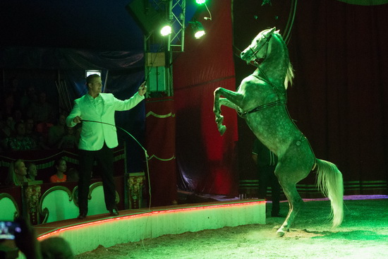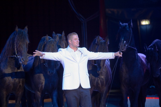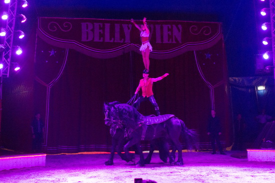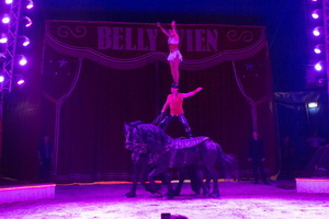 Der Circus Belly-Wien beeindruckt nicht nur mit einem erstklassigen Erscheinungsbild, auch das von vielen tierischen Höhepunkten geprägte Programm begeistert. Vor, trotz sommerlicher Hitze, restlos voll besetztem Haus eröffnete Juniorchef Marlon Zinnecker mit einem wahrlich circensischen Highlight die Spielfolge. Die herausragende Freiheitsdressur der Sonderklasse mit acht Friesen läuft perfekt. Eine Vielzahl verschiedenster Figuren - Gegenläufe, Fächer zu vier und zu acht, gegenläufige Fächer, Walzer, Volten und Pirouetten - werden schwungvoll in raschem Wechsel geboten. Das gesamte Repertoire einer erstklassigen Freiheitsdressur wird mehr als sicher und souverän vorgetragen. Mit verschiedensten anspruchsvollen Steigern endet die Darbietung unter frenetischem Applaus der Zuschauer in vorzüglicher Weise.