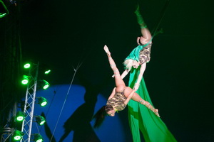 Die "Military Girls" Nadja Scholl und Sarah Zinnecker, begeistern mit einer furiosen, tempogeladenen Darbietung an den Tuchstrapaten. Nebel wabert durch die Kulissen, drei Herren in Camouflage und mit Pumpguns zeigen kurze Breakdanceauszüge und schon fliegen die "Military Girls" mit rasanten Partner- und Solotricks durchs Circusrund. Die kraftvollen Haltetricks und weiten, temporeichen Flüge werden allesamt ohne jede Sicherung gearbeitet, desgleichen zahlreiche spektakuläre Abfaller wie sie andernorts nur höchst selten gezeigt werden. Auch ist der aufbrandende Applaus Gradmesser einer mitreißenden Luftdarbietung.