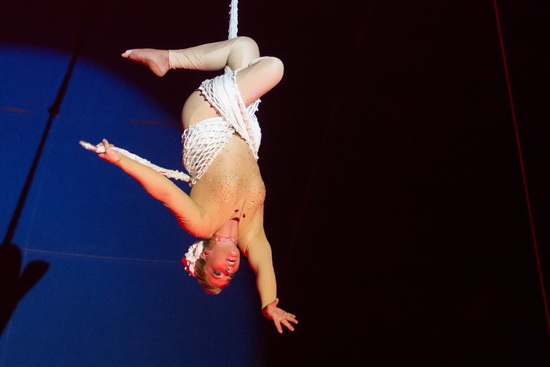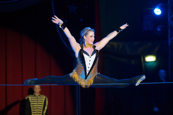 Mandy Zinnecker arbeitet ihre neu gestaltete, trickstarke Kür auf dem gespannten Silberdraht. In einem glamourösen Look, mit schwarzem Zylinder und Stöckchen, tritt sie vor den Vorhang und beginnt ihren Tanz in der Manege. Bald wechselt sie auf das Seil und vielerlei Schrittfolgen wechseln sich mit den unterschiedlichen, sehr sicher ausgeführten Balancen ab. Ein gekonnter Spagat beendet den mitreißenden Auftritt. Die zweite Nummer führt die junge Artistin hoch unter die Kuppel des Chapiteau. Ihre Luftartistik in und an einem Netz zeigt kraftvoll ausgeführte Tricks und mit weiten Flügen füllt sie die Kuppel.