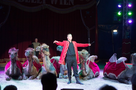 Sechs prächtige, mit edlen roten Schabracken geschmückte Steppenkamele präsentiert Marlon Zinnecker in einem weiteren Auftritt. In abwechslungsreichem Ablauf laufen die Trampeltiere ihre variantenreichen Figuren. Flott und ohne zögern folgen sie den Anweisungen des Tierlehrers.