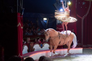 Das Duo Stipka beendet mit seinen Auftritten beide Programmteile. Vor der Pause begeistert Eliane Stipka-Biasini mit einem selten zu sehenden Hula Hoop zu Pferd. Zunächst tanzt die grazile Artistin mit einem mächtigen Ross im Stil einer Ballerina durch die Manege. Dann lässt die Panneau-Reiterin in unterschiedlichster Weise die Reifen um ihren Körper rotieren.