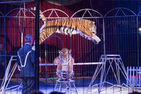 Die hauseigene Raubtierdarbietung wird natürlich von Direktor Roman Zinnecker persönlich präsentiert. Der erfahrene Dompteur lässt die Tiger u. a. verschiedene Sprungvarianten, Hochsitzer, Rollover, Teppich, Pyramide, Balkenlauf ruhig und souverän ausführen. Provoziertes fauchen und Prankenschläge verleihen dem Auftritt die nötige Würze.