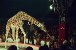 Noch einmal erleben wir Marlon Zinnecker, nun mit den Exoten des Hauses. Erst ziehen ein Ungarisches Steppen- und Schottisches Hochlandrind gelassen ihre Bahnen und zwei Lamas zeigen enormes Sprungvermögen. Dann erscheint die große Giraffe im roten Ring und wie stets entlockt ihr Anblick den Zuschauern laute "Ahhs" und „Ohhs“. Majestätisch bewegt sie sich durch die Manege und gelassen nimmt sie die zuvor verteilten Mohrrüben aus den Händen der Logengäste entgegen. Großes Vertrauen zwischen Mensch und Tier beweist die Futterabnahme aus dem Mund des Vorführers.