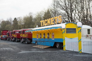 Auf dem innenstadtnahen Festplatz war der Circus aufgebaut. Leider stand der Platz nur eingeschränkt zur Verfügung, da er zur gleichen Zeit als Lagerplatz für Baumaterial einer Straßenbaumaßnahme diente. So konnte der Circus nicht, wie gewohnt, seine glanzvolle Front aufstellen. Die mächtigen, chromblitzenden Zugmaschinen standen in einer langen Reihe, in die auch der prächtige Kassenwagen eingegliedert war. Einige Zaunelemente und das Zeltdach des Eingangs ergänzten die Anordnung. Auf das Vorzelt musste auf Grund der Platzsituation verzichtet werden und der Verkaufswagen der Circusrestauration stand direkt vor dem Zelt.