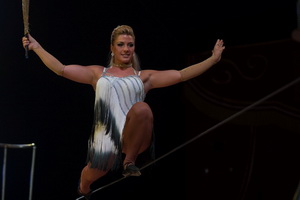 Mit einer klassischen Disziplin, dem Seiltanz startet Mandy Zinnecker die Spielfolge. Gekonnt und schwungvoll präsentiert sie mit großer Sicherheit ihre Balancen und Schrittfolgen auf dem gespannten Seil. Mit einem veritablen Spagat findet der Auftritt seinen gelungenen Höhepunkt.