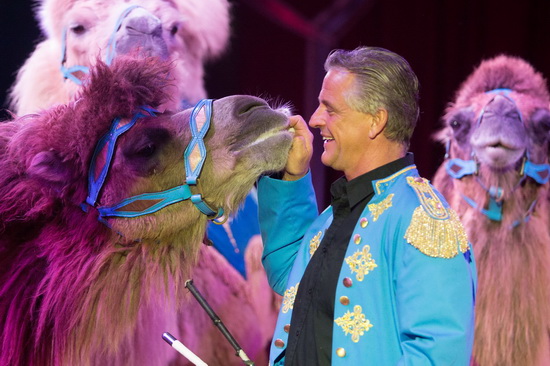 Zunächst präsentiert der Chef des Hauses sechs Kamele. Königsblaue Schabracken schmücken die Trampeltiere, die eine abwechslungsreiche und fehlerfrei vorgetragene Laufarbeit bieten.