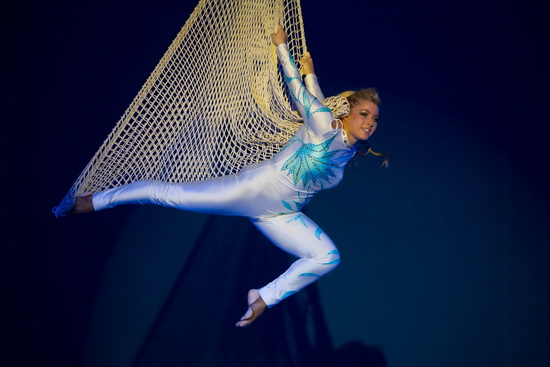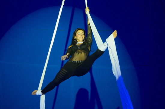 Nadja Scholl präsentiert eine temporeiche Darbietung an den Tuchstrapaten. Temperamentvoll füllt sie mit weiten Flügen die weite Kuppel des Zeltes und zeigt ein ums andere Mal spektakuläre und ungesichert ausgeführte Abfaller.