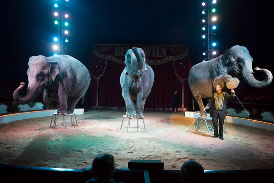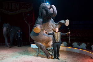 Marlon Zinnecker präsentiert erstmals in seiner Tierlehrerkarriere drei mächtige asiatische Elefanten. Souverän lässt er die umfangreiche, tiergerechte Trickfolge ausführen. Umfangreiche Laufarbeit wird mit abliegen und Hochsitzern abwechslungsreich kombiniert. Ruhig, gelassen und bereitwillig befolgen die Dickhäuter die Anweisungen.