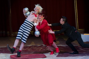 Die “Clowns Boutique”, Evgeny Butorin und seine Familie, verbreiten mit ihren hervorragend gespielten und nicht so oft zu sehenden Reprisen Frohsinn. Im ersten Auftritt präsentieren sie eine flott vorgetragene Hutjonglage. Frau Butorin verfügt, so scheint es, über magische Kräfte. Verschwindet doch jedes Mal das Ei, das ihr Mann auf einen Hocker legt, wenn sie sich darauf setzt, ohne Schaden zu nehmen oder Spuren zu hinterlassen. Bei seinem Selbstversuch sieht es dagegen anders aus. Mit einer mächtigen Bull-Peitsche zerlegt Evgeny Butorin Zeitungsseiten in Papierschnipsel und bindet auch einen Logenbesucher in den Ablauf mit ein. „Evgeny – stärkster Mann“ - mit einer turbulenten Parodie einer Kraftjonglage komplettiert das Trio seine Auftritte, die allesamt den Stil der russischen Circusschulen erkennen lassen.