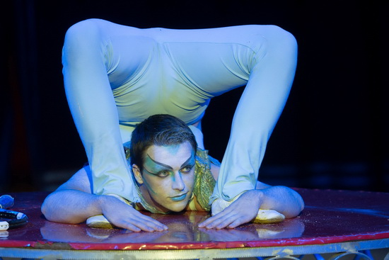 Im weiteren Verlauf der Show präsentiert der junge Mann seine Kontorsions-Künste. Geschmeidig erfolgen die vielseitigen Evolutionen und ein ums andere Mal bringt Garrett seine Gliedmaßen in extreme Positionen. U.a. durchsteigt er einen Tennisschläger.