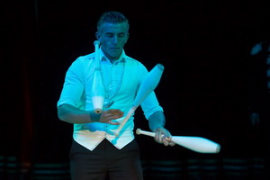 Aron Zinnecker präsentiert seine variantenreichen Tempojonglagen als Finalnummer. Sicher und gekonnt führt er die vielfaltigen Routinen mit Tennisbällen, Ringen, Keulen und aus. Fünf Keulen und sieben Keulen werden souverän gehandhabt und mit effektvollen Muster mit Fackeln hat der Auftritt seinen idealen Abschluss.