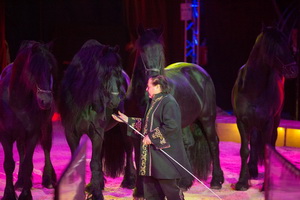 Die flott ablaufende Nummernfolge wird von Direktor Klaus Köhler mit einer Pferde-Freiheit eröffnet. Vier prächtige, tiefschwarz schimmernde Friesenhengste laufen eine Vielzahl unterschiedlicher Figuren. Souverän leitet der versierte Vorführer die Darbietung und ein weiteres Pferd, ein Schimmelhengst, umspielt die Formation der Friesen. Mit einem gekonnten Da Capo Steiger findet der Auftritt seinen idealen Höhepunkt.