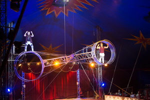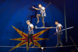 Beide Teile der Show münden in einen Auftritt der Truppe Gerlings. Zunächst sehen wir die drei Truppenmitglieder auf dem Hochseil. Tänzerisch und mit südamerikanischem Temperament wird die umfassende Abfolge der gängigen Tricks vorgetragen. Sprung über den Partner, Seil springen, freier Stand auf einem Stuhl, Fahrrad fahren und eine Dreier-Pyramide gehören zu den Elementen die souverän geboten werden. Selten zu sehen dagegen die Überquerung des Seil „blind und mit gefesselten Füßen“. Die Spannung auf den Rängen ist förmlich greifbar, wenn der Ausführende, die Füßen mit einem Strick eng aneinander gebunden und einer Kapuze über dem Kopf, mit kurzen Sprüngen von einer Plattform zu anderen wechselt.
