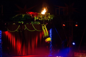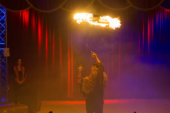 Rouven Köhler ist im zweiten Programmteil unter dem Künstlernamen „Mahado“ mit einer fulminanten Feuershow zu erleben. Gekonnt werden zahlreiche Fackeln im Mund gelöscht und mit im Mund gehaltener Flamme wieder neu entfacht. Langsam streichen die lodernden Flammen über Hände und Arme und hohe, kraftvoll ausgestoßene Feuersäulen steigen in die Kuppel. Schließend lässt „Mahado“ ein lichterloh brennendes Feuerrad auf einem Handstab rotieren und immer wieder in hohem Bogen von einem auf einen anderen Stab fliegen. Abschließend präsentiert er einige große Würgeschlangen und ein recht großer Alligator läuft eine Runde um die Manege.