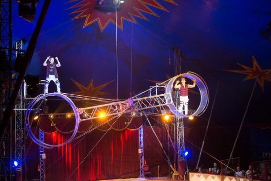 Genau so temperamentvoll erfolgt abschließend der Auftritt auf dem Todesrad. Manch kollektiv ausgestoßenes „Ah“ und „Oh“ ist vernehmbar ob der riskanten Aktionen am schnell rotierenden Requisit. Blindlauf und hohe Absprünge bilden die Höhepunkte der Darbietung.