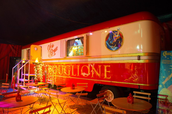 Ein Portier im dunkelblauen, mit goldenen Borden besetzten Mantel empfängt die Besucher am Eingangsportal. Weit geöffnete Türen geben den Weg in das Restaurationszelt frei. Die Seiten sind mit Planen, die ein rotes Vorhangmotiv zeigen, verkleidet und ein Holzboden bedeckt den Untergrund. Ein großer Verkaufswagen nimmt die eine Schmalseite komplett ein. In drei Containern sind Popkorn- und Zuckerwattestation untergebracht. An der vierten Seite hat das „Café des Artistes“ seinen Platz. Der große Circuswagen mit den eleganten runden Ecken ist in rot und cremeweiß, hochglänzend lackiert und die Inneneinrichtung wurde aufwändig und detailverliebt ausgeführt. Ein kleiner Biergarten direkt vor dem Wagen komplettiert den Bereich. Während des Einlasses musiziert Clown Don Christian zusammen mit dem Circusorchester im Vorzelt, die Besucher werden mit Konfettiregen empfangen und viele Nasen verziert rote Farbe, während ein Keulenjongleur sein Können zeigt.