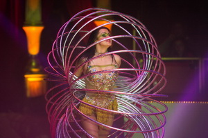 Alla Klystha präsentiert eine Hula Hoop Darbietung, die sich deutlich vom Gros des Genres unterscheidet. Charmant lässt die versierte Artistin die Ringe in immer wieder neuen und ungewöhnlichen Varianten um ihren Körper kreisen. Zum Höhepunkt ihres Auftritts manipuliert sie sieben Reifen zur gleichen Zeit.