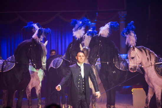 Die dritte und letzte Darbietung mit Tieren in diesem Programm bietet Gianni d' Ambrosio mit seinen Freiheitspferden gleichfalls im ersten Teil. Mit drei Friesen und drei schneeweißen Hengsten werden eine Reihe interessanter Figuren geboten. Ruhig und souverän lässt der erfahrene Dresseur die Darbietung ablaufen. Ein kurzes Groß-und-Klein sowie einige Steiger werden als Da Capo gezeigt.