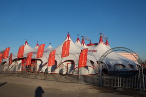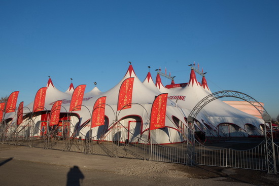 Hinter dem dekorativen verchromten Zaun, mit Lichterbögen und zahlreichen Fahnen an Peitschenmasten, beherrschen die mächtigen Zeltanlagen das Gelände. Ein schneeweißes modernes Viermasten Chapiteau italienischer Bauart, dessen Plane bis zu den Mastspitzen reicht und die langgestreckte Kuppel überragt. Am Rondell ist die Dachplane in eleganten Bögen weit nach außen gezogen und in riesigen roten Lettern leuchtet der Circusname ringsum in der Wintersonne vom Zeltdach. Ein optisch perfekt passendes fünfmastiges Foyerzelt ergänzt die Anlage.