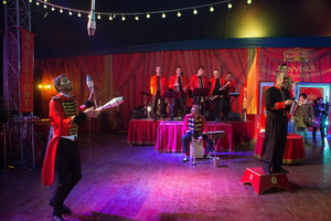 Ein Portier im royalblauen, mit goldenen Borden besetzten Mantel empfängt die Besucher am Eingangsportal. Weit geöffnete Türen geben den Weg in das Restaurationszelt frei, dessen Seiten mit Planen, die ein rotes Vorhangmotiv zeigen, verkleidet sind. Ein großer Verkaufswagen nimmt eine Schmalseite des Zeltes ein und in drei weiteren Containern sind Popcorn- und Zuckerwattestationen untergebracht. An der zweiten Schmalseite hat das „Café des Artistes“ seinen Platz. Der große Circuswagen mit den eleganten runden Ecken ist hochglänzend in rot und cremeweiß lackiert und im Innern aufwändig und detailverliebt eingerichtet.