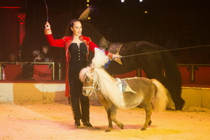 Marion Bouglione präsentiert gekonnt ein munteres Groß-und-Klein. Ein Friesenhengst und dunkelbraunes Fallabella-Pony interagieren zur Freude der Besucher im roten Ring. Flott und sicher werden die bekannten Abläufe des Genres von der charmanten Vorführerin abgerufen.