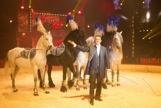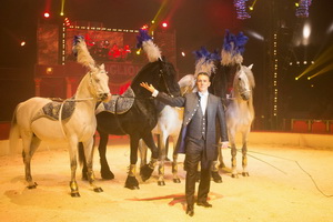 Gleich im Anschluss ist Gianni d' Ambrosio mit seinen Freiheitspferden zu erleben. Mit drei schneeweißen Hengsten und zwei Friesen präsentiert der versierte Dresseur eine abwechslungsreiche Darbietung. Ruhig und souverän laufen die vielfältigen Figuren ab und mit einigen Da Capo Steigern findet der Auftritt seinen Höhepunkt.