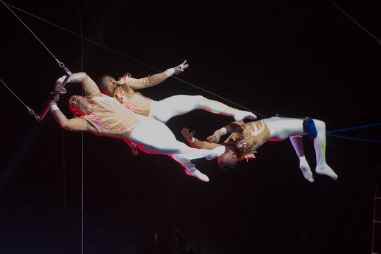 Die „Flying Mendonca“ präsentieren ihren temperamentvoll vorgetragenen Auftritt am Trapez vor der Pause. Zwei Flieger und zwei Fliegerinnen bieten eine Reihe unterschiedlicher Saltos, die allesamt sicher gefangen werden. Dreifacher Salto und Passage sind die abschließenden Höhepunkte der Nummer.