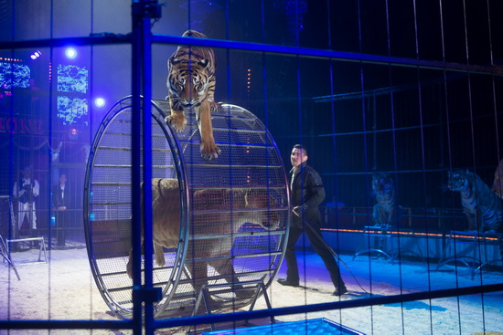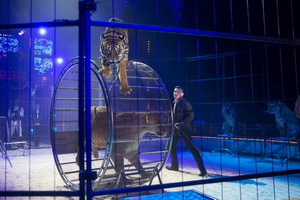 Der zweite Teil der Show startet mit der Raubtier-Dressur von Tom Dieck junior. Die interessante Formation aus zwei weißen Löwen, zwei Ligern und vier Tigern beherrscht ihr umfangreiches Repertoire routiniert und agiert bei ihrer Premiere in der neuen Umgebung des Bouglione-Zeltes souverän.