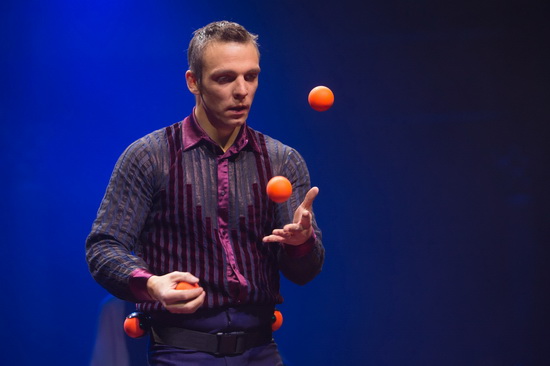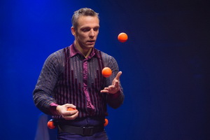 Sampion Bouglione kombiniert Stepptanz und Bodenjonglage zu einer harmonischen Darbietung. Auf einer Plattform, unter der sich ein Mikrophon befindet, werden die Jonglagemuster genauso exakt in den Rhythmus der Musik eingebunden wie die Tanzschritte.
