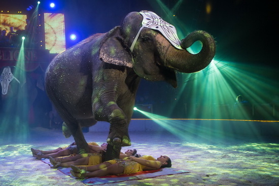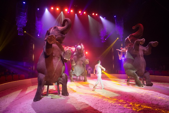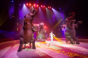 Elvis Errani bietet mit seinen drei asiatischen Elefanten – Baby, Juba und Mala – einen der Höhepunkte der Show. Nur mit seiner Stimme dirigiert er die drei Dickhäuter zu ihren effektvollen und temporeich ausgeführten Aktionen in der ausgezeichneten Dressurfolge.