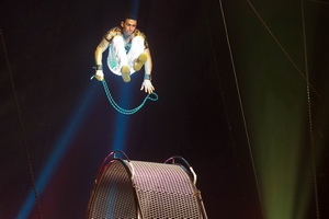 Natalia Egorowa- Bouglione brilliert mit einer enorm kraftvollen Arbeit an den Strapaten. Viele einarmige Aufschwünge folgen aufeinander und kräftezehrende Haltetricks begeistern ob der Leichtigkeit in der Ausführung. Souverän im Verkauf und hervorragend in Szene gesetzt wird dieser Auftritt zu einem Highlight unter der Kuppel.