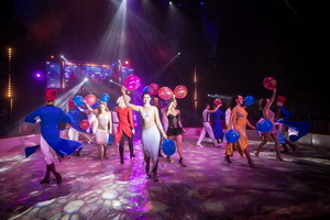 Weiße Säulen gliedern den Artisteneingang, der dem des Cirque d' Hiver in Paris nachempfunden wurde. Eine große LED-Wand schließt das Musikerpodium ab und ermöglicht vielfältige visuelle Effekte, die das großartige Lichtdesign, das Gilbert Weiser geschaffen hat, in idealer Weise ergänzen. In, für ein schnell reisendes Unternehmen einmaliger Weise wird die Show in Szene gesetzt.