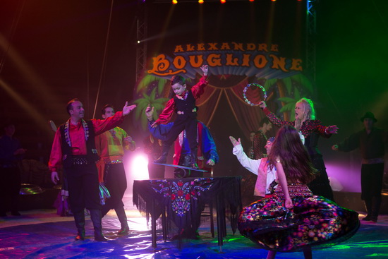 Die diesjährige Produktion, die unter dem Motto „Tzigane“steht, beginnt folgerichtig mit einem großen Schaubild im Zigeuner-Look. Die gesamte Truppe belebt die Manege. Es wird getanzt, man flaniert umher, es werden Kostproben des Könnens gegeben und die jüngste Generation Bouglione steigt schon einmal auf das Rola-Brett, bzw. lässt ein paar Hula Hoop Ringe kreisen.