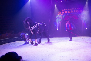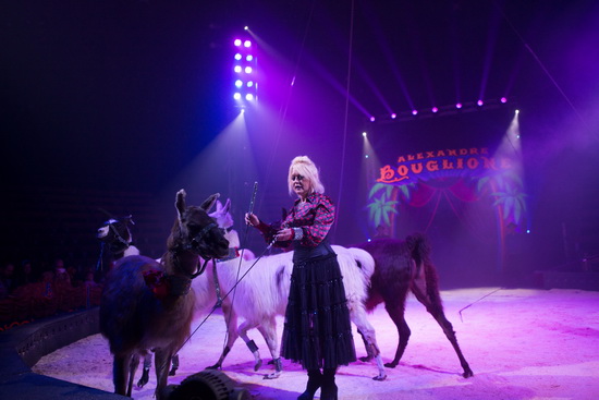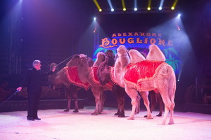 Weitere Dressurdarbietungen werden von der Direktion des Hauses präsentiert. Alexandre Bouglione bringt vier prächtige Steppenkamele in den roten Ring. Mit großer Souveränität leitet der erfahrene Maestro die Trampeltiere zu den verschiedenen Figuren an.