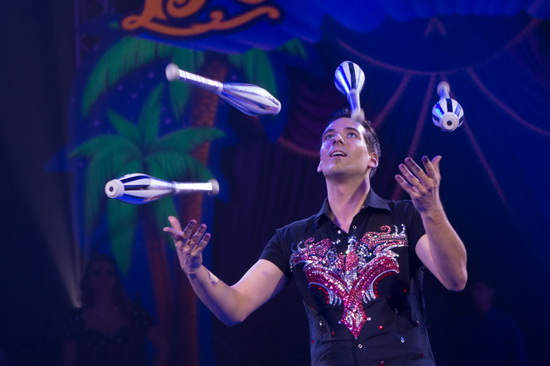 Jongleur Nandor Petruska arbeitet umfangreiche Routinen mit drei, vier und fünf Keulen. Sicher und routiniert werden die Muster ausgeführt. Im zweiten Teil des Auftritts werden bis zu neun Ringe jongliert, ehe mit einer effektvollen Fackeljonglage der Höhepunkt der Darbietung erreicht ist.