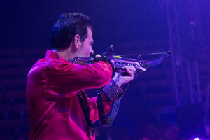 Die furiose Kunstschützen und Messerwurf Darbietung des Duo Jasters wird vor der Pause aufgeboten. Mit großer Treffsicherheit zerplatzen knapp neben dem Kopf der Partnerin platzierte Luftballons unter den von einer Armbrust abgefeuerten Pfeilen. Selbstverständlich gehört auch der „Tell-Schuß“ zum Repertoire. Die Wurfmesser finden auch durch eine, die Partnerin verdeckende Papierbahn hindurch sicher das Ziel, ebenso die Würfe auf die rotierende Scheibe.