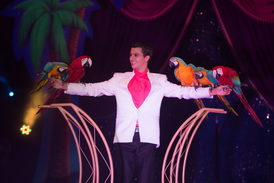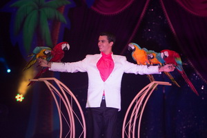 Die Auswahl an Nummern mit tierischer Beteiligung komplettiert Dan Laurentiu mit seinen Papageien. Die Aras zeigen turnerisches Talent bei Rollen auf dem Manegenboden und „Riesenwelle“ um die Sitzstange. Einer Zuschauerin wird eine Blume „überbracht“. Ein kleinerer Papagei fliegt durch Ringe, die von Kindern hochgehalten werden. Die abschließenden Flüge der Aras durch das gesamte Chapiteau faszinieren auch in diesem Rahmen.