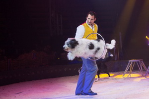 In einem weiteren Auftritt sehen wir Juniorchef Nikolas Bouglione mit einer munteren Hundemeute. Die sechs schwarz-weißen Energiebündel verschiedener Größe sind mit überschäumender Spielfreude bei der Sache und präsentieren allerlei Sprungvarianten.