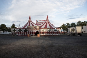 Die zahlreichen weiß-rot lackierten Sattelauflieger sind entlang der Platzseiten abgestellt und mit dem Circusnamen beschriftet. Die Wohnwagen der Direktionsfamilie und der Artisten und Angestellten nehmen den übrigen Raum ein.