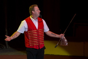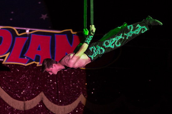 Menowin Frank, der jugendliche Artist hatte vor ca. vier Wochen sein Manegendebut, hat sich die Strapaten als Genre ausgewählt. Kraftvoll und in erstklassiger Ausführung präsentiert er eine umfassende Anzahl hochkarätiger Tricks. Kreuzhang, Waage und weitere Figuren werden spielerisch leicht wirkend ausgeführt.