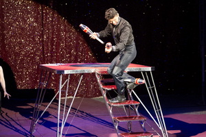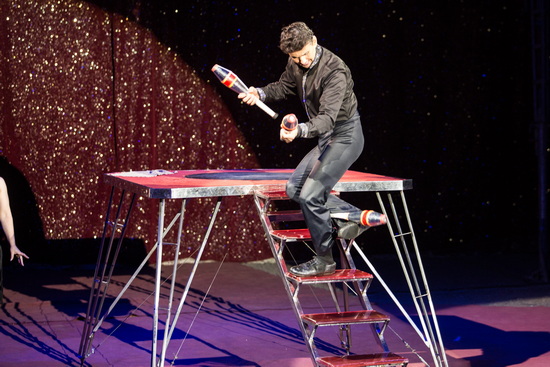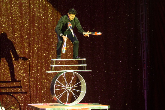 Einen rasanten und interessanten Auftritt bietet David Arriola Mark mit seiner Kombination von Jonglage und Rola Rola. Er beginnt seine vielfältigen Routinen mit Keulen in der Manege, doch schon bald geht es hinauf auf einen Tisch. Besonders die gelungenen und vielseitigen Fußkicks stechen hervor. Nach diversen Balancen auf der Rola zeigt sich der quirlige Artist als Bounce-Jongleur und bezieht wiederum die Treppe in seine Evolutionen ein. Schließlich ruht sein Rolabrett auf einem „Speichenrad“ von gut einem halben Meter Durchmesser. Darauf stapeln sich mehrere flache Bänkchen und auf diesem labilen Konstrukt jongliert Arriola mit Keulen.